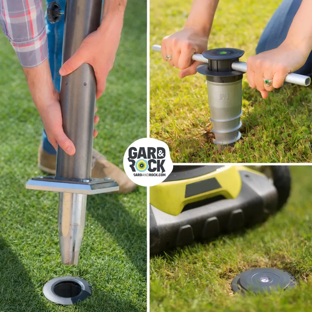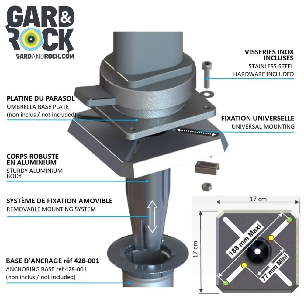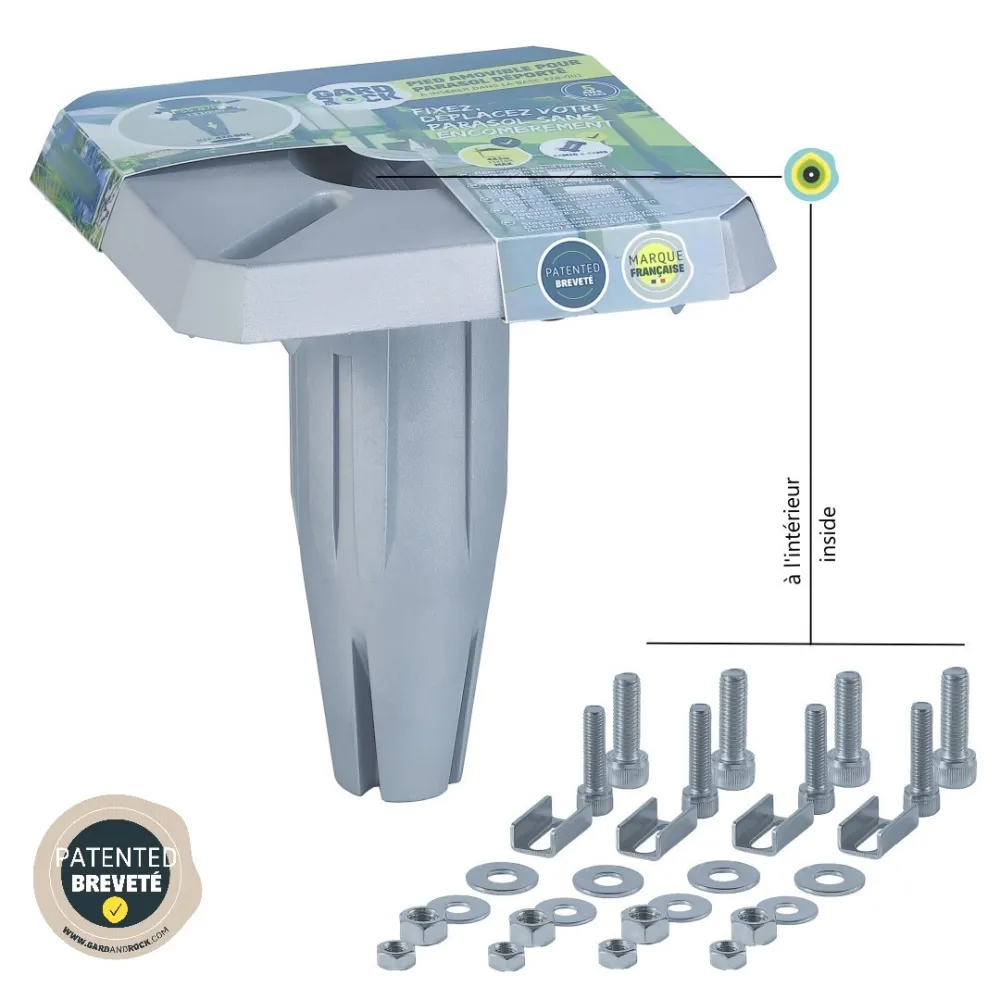 El pie de fijación Gard&Rock permite un anclaje al piso sólido y extraíble de su equipamiento al aire libre (sombrillas, gazebos, banderas, pajareras, equipamientos deportivos, ...). Simplemente enganchando en la base de anclaje (se vende por separado), ¡podrá organizar o liberar espacio en un instante para disfrutar su jardín plenamente!