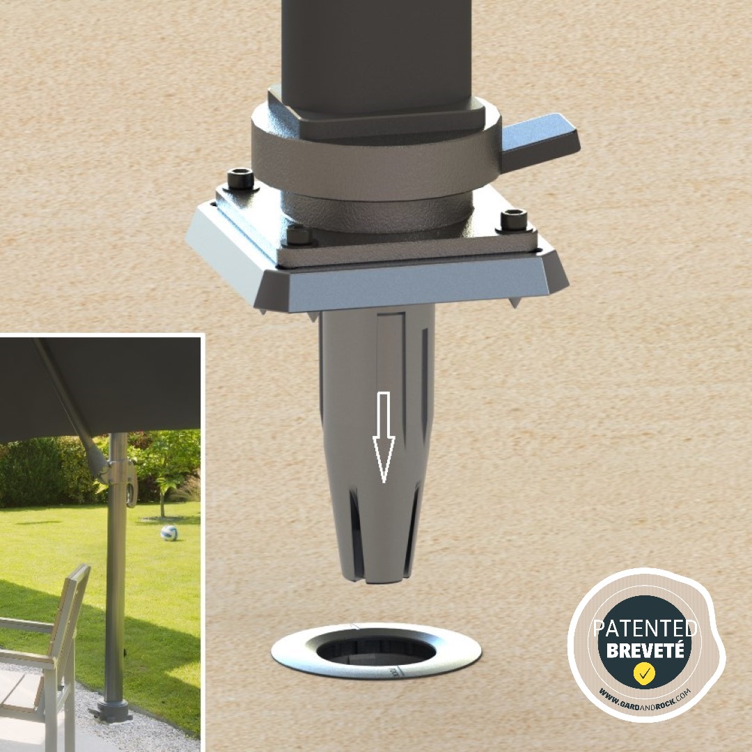 Sistema práctico, permite un rápido acondicionamiento de su espacio exterior. En combinación con los productos de la gama Gard&Rock de gran escabilidad, usted podrá en un instante, encastrar, cambiar de lugar y almacenar su equipamiento de exterior (sombrillas, hamac, pérgolas, toldos, tendederos de ropa, pajareras, material deportivo...). De hermoso diseño y discreto, el pie para anclaje se integrará armoniosamente al paisaje.