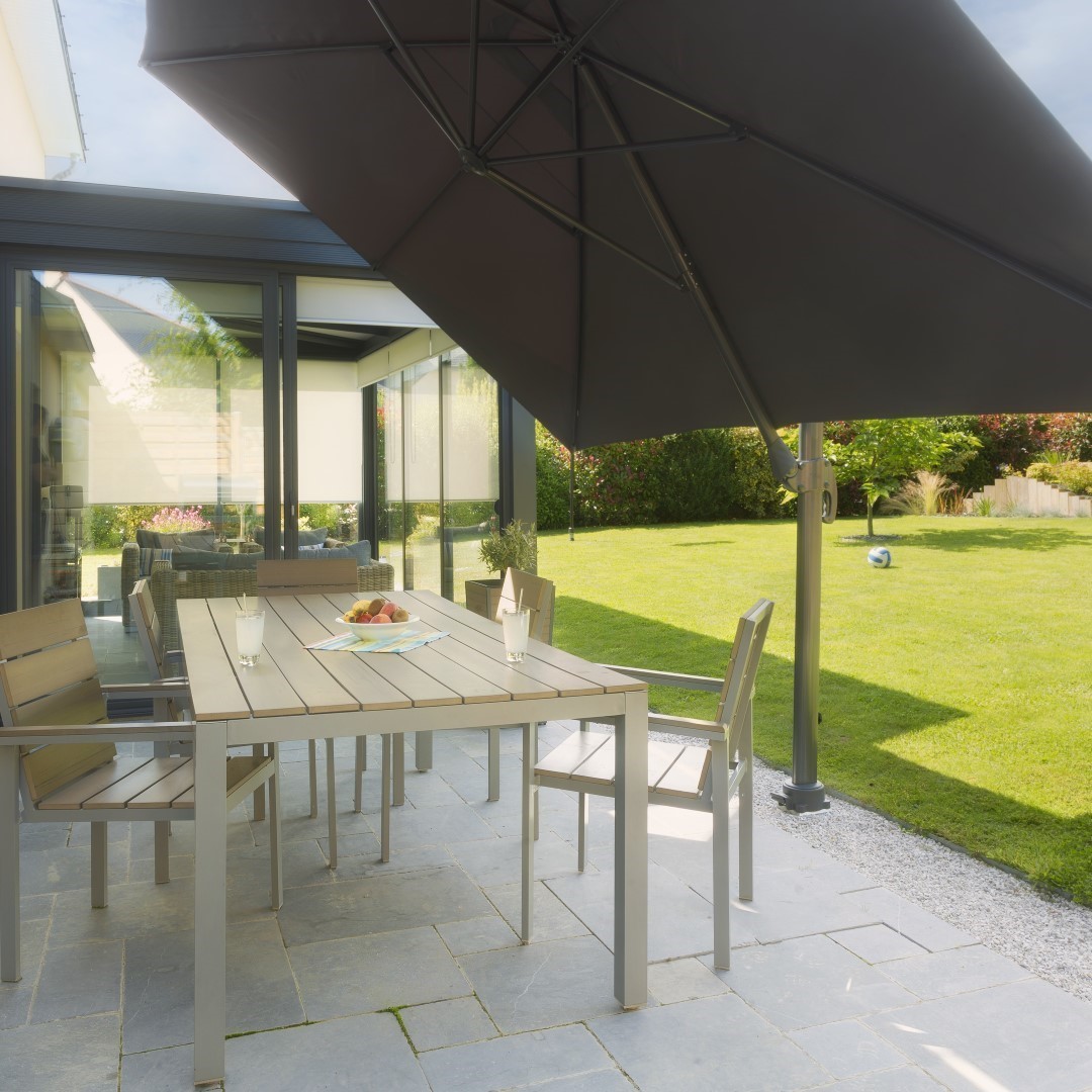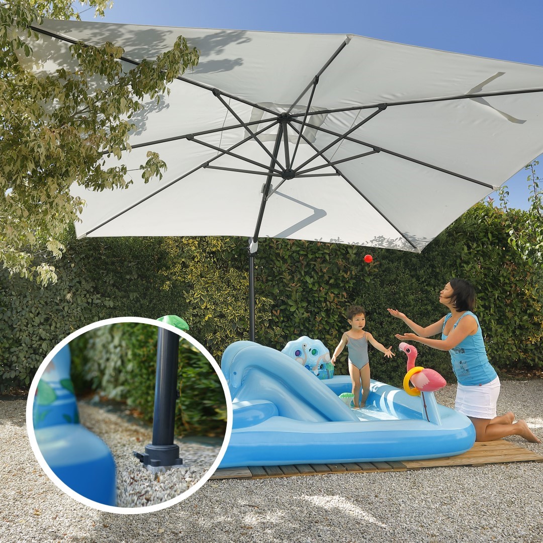 Sin tener que mover baldosas pesadas de cemento, puede instalar y cambiar de lugar sus sombrillas desperdigadas por todo el jardín (césped, pavimento, canteros, borde de la terraza, ...) e incluso en terreno inclinado. Una forma discreta y estética de disfrutar su jardín.